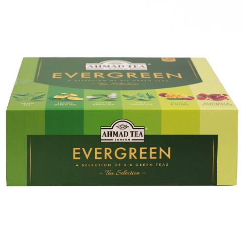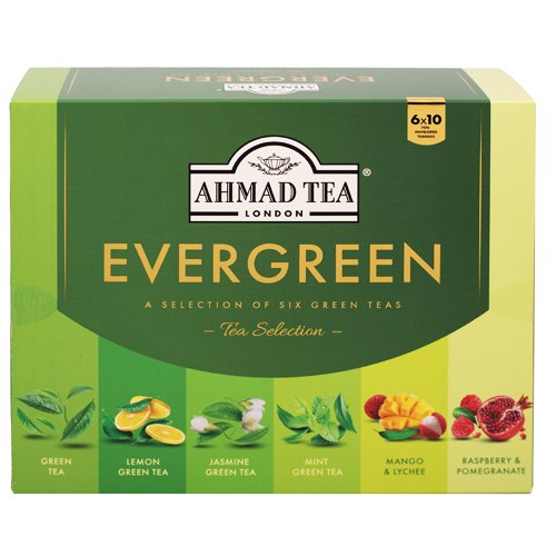 Ahmad Tea Evergreen selection with 6 different kinds of green tea: Green tea, Mint green tea, Jasmine green tea, Lemon green tea, Mango & Lychee green tea and green tea with raspberry and pomegranate.Tea bags with strings, individually foil wrapped, allow preserving the tea, flavour and aroma. Brewing should take approximately 3-5 minutes.